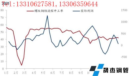 而對於2021年的數據來說無論是相關分析還是回歸分析結果表現出與其他年份有不同的結果,這與2021年的特殊情況有關。由於2021年螺紋鋼價格的急劇變化,導致電弧爐實際利潤具有了極強的波動性,而且由於能耗雙控,從8月底電弧爐無縫宅男在线小视频鋼管廠家被嚴格限產,導致了電弧爐開工率有近20%左右的持續下降,創造了曆史低位,政策以及成材價格變動明顯幹擾了數據的觀測,如下圖所示:
