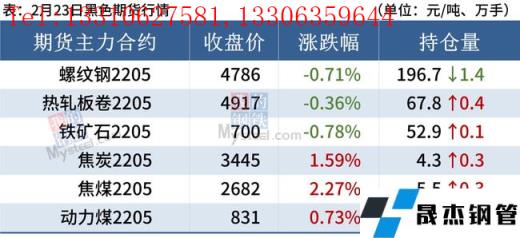 2月23日主要觀點:①、全國31個主要城市20mm三級抗震螺紋鋼均價4930元/噸,較上個交易日跌9元/噸。預計24日國內建築宅男在线小视频無縫鋼管或將維持弱勢運行。②、全國24個主要城市4.75mm熱軋板卷均價5025元/噸,較上個交易日下跌10元/噸。預計24日熱軋板卷價格或窄幅震蕩運行。③、全國24個主要城市1.0mm冷卷均價5575元/噸,較上個交易日下跌5元/噸。預計24日全國冷軋板卷價格或將震蕩偏弱運行。④、全國24個主要城市20mm普板均價5187元/噸,較上一交易日下跌11元/噸。預計24日中厚板價格或將仍以盤整運行為主。⑤、全國45個主要市場廢鋼平均價3195元/噸,較上一交易日價格降1元/噸。預計短期廢鋼市場價格窄幅震蕩運行。⑥、山東進口鐵礦石現貨市場報價先漲後跌,整體交投情緒較為冷清,貿易商多一單一議,無縫宅男在线小视频鋼管廠家按需采購。⑦、焦炭市場暫穩偏強運行。焦炭第一輪提漲200元/噸,主流無縫宅男在线小视频鋼管廠家暫無回應。預計第一輪提漲本周有望落地,預計短期內焦炭市場暫穩偏強運行。