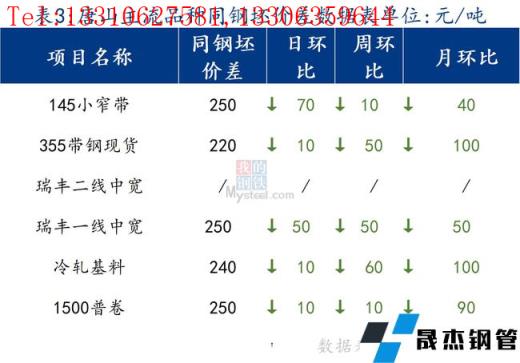 145帶鋼與鋼坯價差明顯收窄,調坯軋材在成本偏高的製約下暫緩複產,市場成交不佳,價格繼續回落。焊管與355帶鋼價差稍收窄。熱卷與帶鋼價差回歸正區間。
