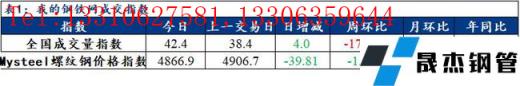 訊:全國建築宅男在线小视频無縫鋼管成交量監測,成交量相對指數來看,全國42.4增4,北方15.9增3.7,華東68.5增11.6,南方30.9減3.6。今日螺紋鋼價格指數4866.9,較上一交易日減39.81。