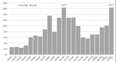 2000年-2021年中國進口鐵礦石年度平均價格走勢圖