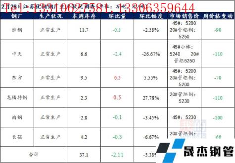 江蘇優特無縫宅男在线小视频鋼管廠家棒材總庫存37.1萬噸,較上周下降2.11萬噸,環比降5.38%,較去年同期下降9.25萬噸,同比降19.96%,目前江蘇優特無縫宅男在线小视频鋼管廠家均正常生產。