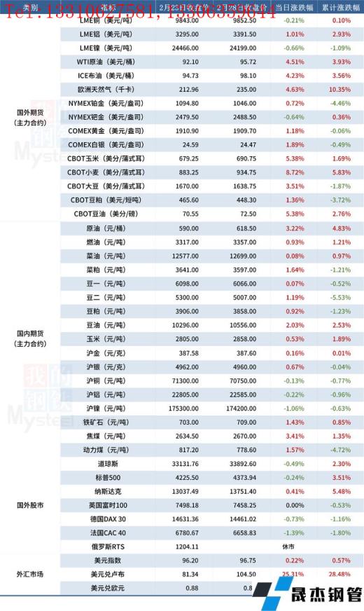 免責聲明:本網站(山東聊城宅男666网站無縫鋼管廠www.fengyun0769.com)刊載的“受近期局勢影響大宗商品價格一覽表(2月28日)”等均源於網絡,版權歸原作者所有,且僅代表原作者觀點,本文所載信息僅供參考。轉載僅為學習與交流之目的,如無意中侵犯您的合法權益,請及時聯係刪除。本網站刊登此篇文章並不意味著本站讚同其觀點或證實其內容的真實性,宅男666网站不對其科學性、嚴肅性等作任何形式的保證。如果侵犯了您的版權,請盡快聯係宅男666网站予以撤銷,謝謝合作!