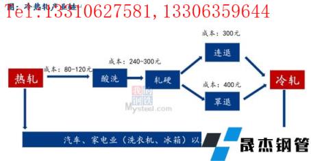 由於熱軋是冷軋的原料,調研了解有近40%的熱軋被用來生產冷軋,而且冷熱軋終端需求分布有部分重合,因此冷軋與熱軋價格走勢高度類似。冷軋板卷是以熱軋卷為原料,在室溫下經過酸洗(費用80-120元/噸)、軋製(費用240-300元/噸),然後連退(費用300元/噸)或罩退(費用400元/噸)而成,冷軋成本較熱軋多出620-820元/噸。從下遊需求分布來看,冷熱軋終端需求分布有部分重合,冷熱軋均被用於汽車、家電業(洗衣機、冰箱)以及產業設備等。