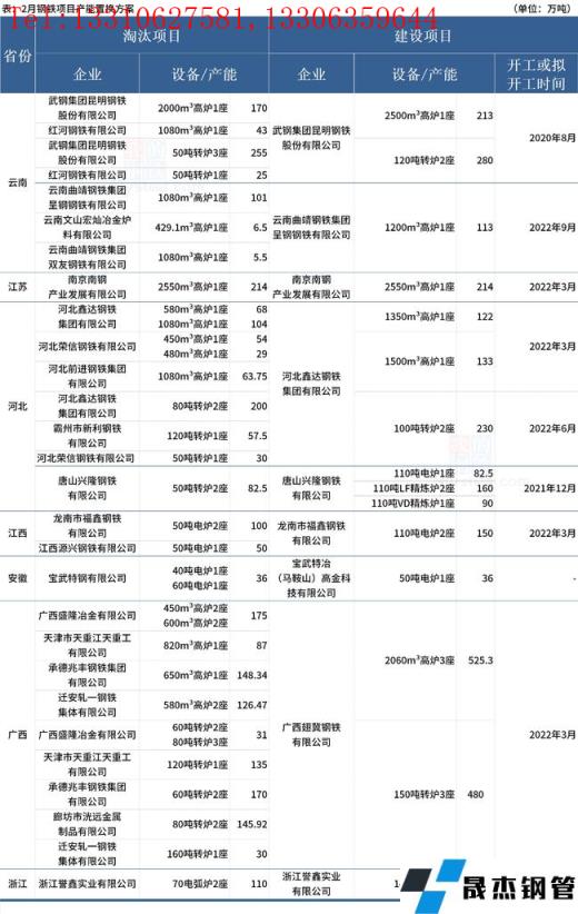 據不完全統計,2022年2月有9家無縫宅男在线小视频鋼管廠家發布鋼鐵產能置換方案。其中,涉及新建煉鋼產能1328萬噸,新建煉鐵產能1320.3萬噸;涉及淘汰煉鋼產能超1567.92萬噸,淘汰煉鐵產能1395.56萬噸。