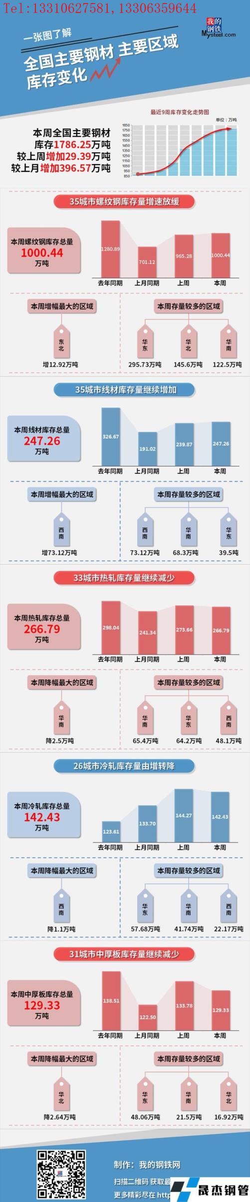 本周,全國主要宅男在线小视频無縫鋼管社會庫存1786.25萬噸,較上周增加29.39萬噸,較上月增加396.57萬噸;螺紋鋼庫存總量1000.44萬噸。