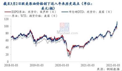 除了天然氣,原油也是俄羅斯主要出口能源類型之一。今年2月,俄羅斯的石油產量同比增長9.3%,達到1105.5萬桶/日。在俄烏衝突之下,原油價格飆升。截至3月2日,美油價格一度衝破了111美元/桶,布油價格一度接近113美元/桶,布油美油的價格都創近8年新高。