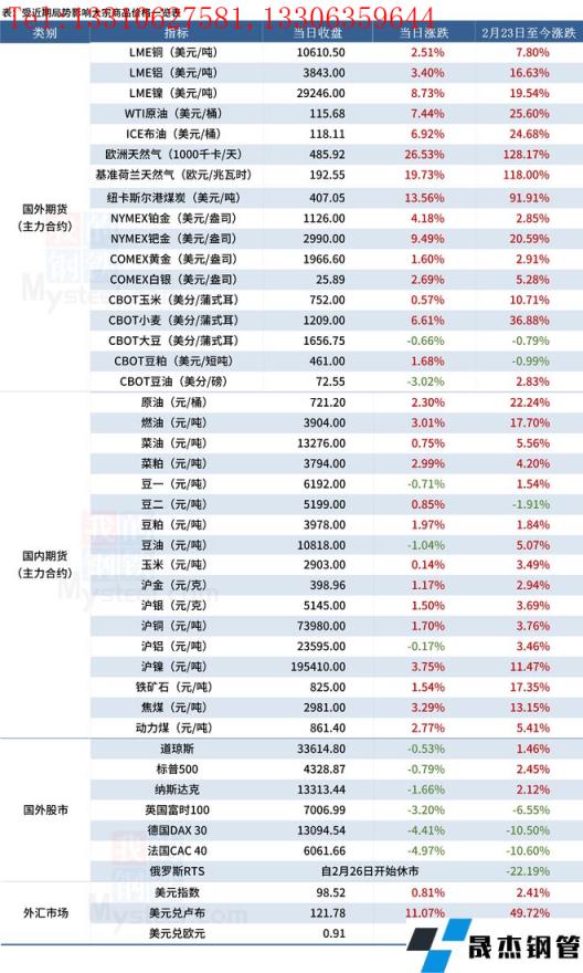 受近期局勢影響大宗商品價格一覽表(3月4日)