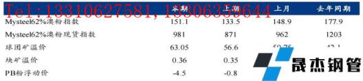 港口現貨與遠期現貨方麵:本周五62%澳粉指數151.1美元/噸,環比增加17.6美元/噸;62%澳粉現貨指數981元/噸,環比增加110元/噸; 65%球團溢價指數為63.05美元/噸,環比漲6.45美元/噸; 62.5%塊礦溢價指數0.36美元/噸度,環比上漲0.02美元/噸度。本周PB粉遠期浮動溢價-4.5美元/噸,環比下跌3.70美元/噸。