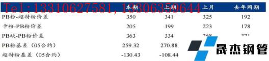 價差方麵:本周高低品價差擴大,截至周五青島港PB粉與超特粉價差350元/噸,環比擴大9元/噸;巴西礦溢價減少,青島港卡粉與PB粉價差205元/噸,環比收窄6元/噸;粉塊價差收窄,青島港PB塊與PB粉價差363元/噸,環比收窄29元/噸。期現基差方麵:PB粉基差259.32,環比走弱11.56;超特粉基差-130.43,環比走弱21.99。