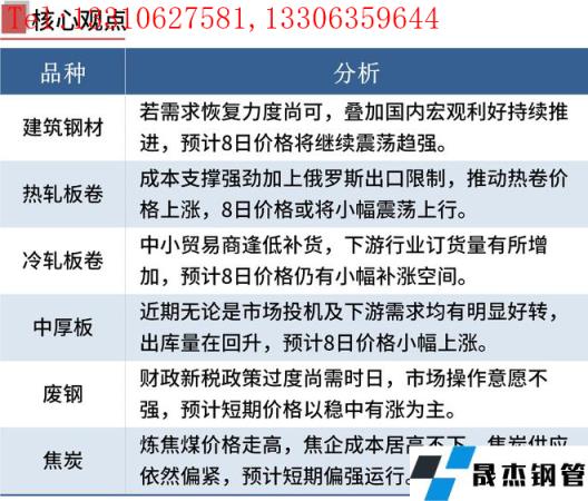 中厚板:3月7日,全國24個主要城市20mm普板均價5303元/噸,較上個交易日上漲65元/噸。供應層麵看,中板產量繼續上行,北方除邯鄲以外,其餘地區無縫宅男在线小视频鋼管廠家基本全部複產,會給市場帶來一定的供應壓力,但高點將有限。流通環節看,近期無論是市場投機及下遊需求均有明顯好轉,出庫量在回升,中板社會庫存連續兩周下降,流通形勢在向好的方向發展。需求方麵,前期需求恢複緩慢,在近期盤麵及現貨價格上漲刺激下,終端拿貨進度開始加快,加上金三已經到了,短期需求繼續回升。綜合預計,8日中厚板價格小幅上漲。