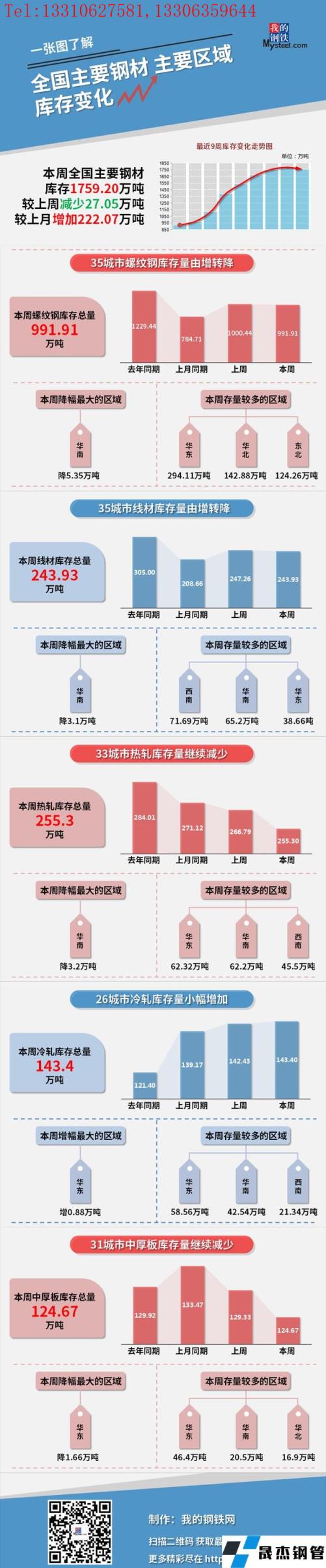 本周,全國主要宅男在线小视频無縫鋼管社會庫存1759.2萬噸,較上周減少27.05萬噸,較上月增加222.07萬噸;螺紋鋼庫存總量991.91萬噸。