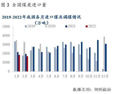 1-2月我國進口煤同環比大幅下降。2022年1-2月進口煤炭3539萬噸,同比下降14.0%,降幅比上年12月份收窄6.9個百分點。主要是受印尼1月煤炭禁止出口政策影響,影響1月下旬以及2月中上旬我國煤炭進口到港,疫情影響我國288口岸蒙煤通關量下降至100車左右,導致1-2月我國煤炭進口量同比大幅回落。2月下旬海外地緣衝突爆發,短期對我國進口有一定影響,對2月影響體現不大。