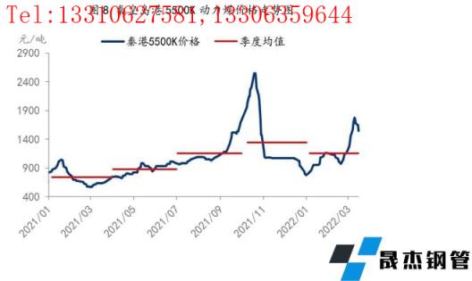 3月供需緊張疊加國際煤價上漲,帶動國內上漲。3月重大會議及賽事召開,以及貴州煤礦事故發生,煤炭主產區安全檢查將加嚴,同時多地疫情反複以及海外地緣衝突影響全球煤炭資源供應結構改變,我國進口煤倒掛嚴重,導致企業轉向國產礦采購增多,但國內煤礦增產空間有限,導致3月煤炭供應緊張情況或加劇。3月天氣逐步轉暖,中下旬北方取暖季結束,煤炭需求將有所下降。此外,3月全國疫情爆發,建築業施工單位停工增多,製造業生產以及其他行業也受到一定影響,全國用電需求難保持高增長,非發電用煤需求較好,整體煤炭需求表現依然尚可。目前,控價格方麵,經批準的長協價為570-770元(以下均對應5500大卡)要嚴格執行,基準價所有煤炭企業按675元執行,坑口價不得超700元,港口不得超900元,管控長協煤力度大,市場煤受限製不大,需求較好,疊加海外地緣衝突影響國際煤價大漲,進而支撐煤價出現大幅上漲。不過,在依法加強市場監管以及陸續釋放煤礦增產信息下,煤價衝高後出現回落。