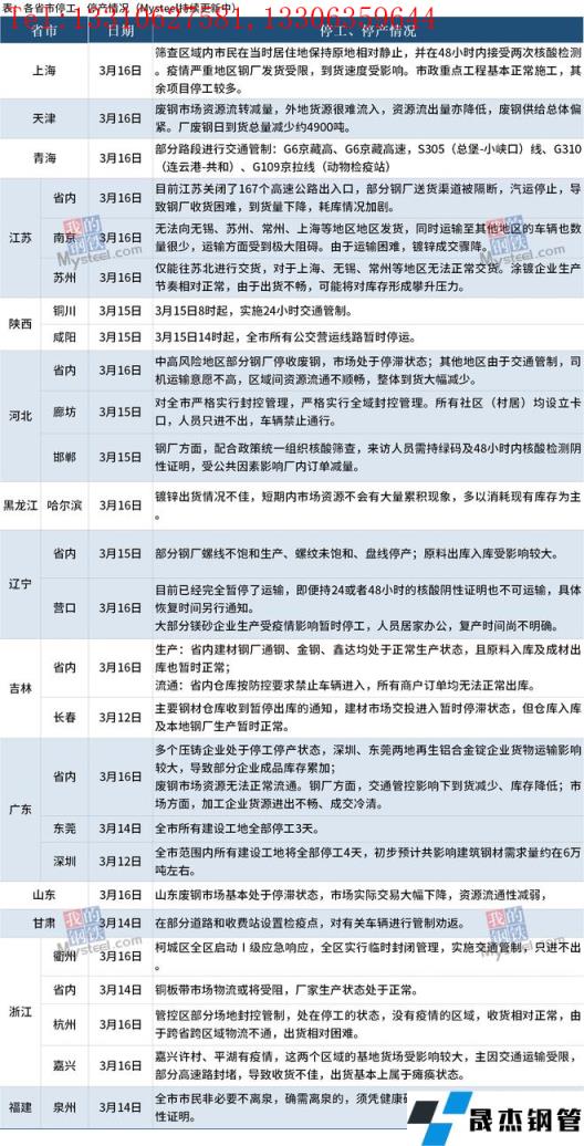 截至3月17日,匯總14個省份停工停產最新信息。其中,上海市疫情嚴重地區無縫宅男在线小视频鋼管廠家發貨受限,到貨速度受影響;市政重點工程基本正常施工,其餘項目停工較多。河北省內中高風險地區部分無縫宅男在线小视频鋼管廠家停收廢鋼 ,市場處於停滯狀態;其他地區由於交通管製,司機運輸意願不高,區域間資源流通不順暢,整體到貨大幅減少。廣東省內多個壓鑄企業處於停工停產狀態,深圳、東莞兩地再生鋁合金錠企業貨物運輸影響較大,導致部分企業成品庫存累加;吉林省省內建材無縫宅男在线小视频鋼管廠家通鋼、金鋼、鑫達均處於正常生產狀態,且原料入庫及成材出庫也暫時正常;省內倉庫按防控要求禁止車輛進入,所有商戶訂單均無法正常出庫。具體情況如下: