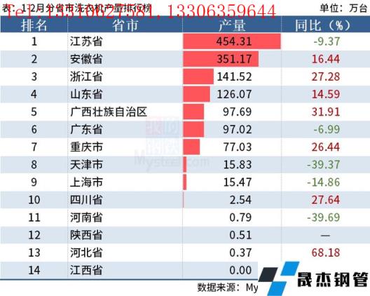 從分省市數據來看,1-2月共有4個省市洗衣機產量超100萬台,其中江蘇省以產量454.31萬台排名第一,安徽省產量351.17萬台排名第二,浙江省產量141.52萬台排名第三。
