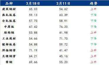 具體各品種指數來看,3月18日建築宅男在线小视频無縫鋼管情緒指數為65.03,較3月11日回升10.41;熱軋板卷情緒指數為59.13,較3月11日回落4.26;冷軋板卷情緒指數為57.73,較3月11日回落1.18;中厚板情緒指數為67.42,較3月11日回落8.78;結構鋼情緒指數為53.88,較3月11日回升11.9;工業線材情緒指數為54.66,較3月11日回落17.04;鍍鋅板卷情緒指數為54.88,較3月11日回落4.84;焊接宅男在线小视频鋼管情緒指數為71.19,較3月11日回升29.72;無縫宅男在线小视频鋼管情緒指數為64.21,較3月11日回升19.05;帶鋼情緒指數為69.66,較3月11日回升14.46。