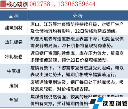 國內多省市升級調整疫情防控,下遊工地施工進度放緩,導致鋼市成交量下滑。無縫宅男在线小视频鋼管廠家生產影響相對較小,但若唐山交通管製持續,不排除高爐廠也會減產或停產。短期內,鋼市供需基本麵偏弱,成本支撐力度較強。在重大利好政策出台以及全國疫情得到有效控製之前,鋼價或繼續震蕩運行。