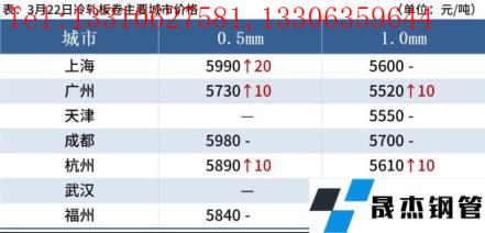 冷軋板卷:3月22日,全國24個主要城市1.0mm冷卷均價5649元/噸,較上個交易日上漲3元/噸。今日黑色係期貨盤麵走勢較強,部分區域熱、冷價差處於持續收窄態勢;受疫情影響,運輸方麵受阻,到貨情況不佳,部分市場現有庫存不多壓力較小,貿易商以出貨回籠資金為主。預計23日國內冷軋板卷價格或將震蕩運行。