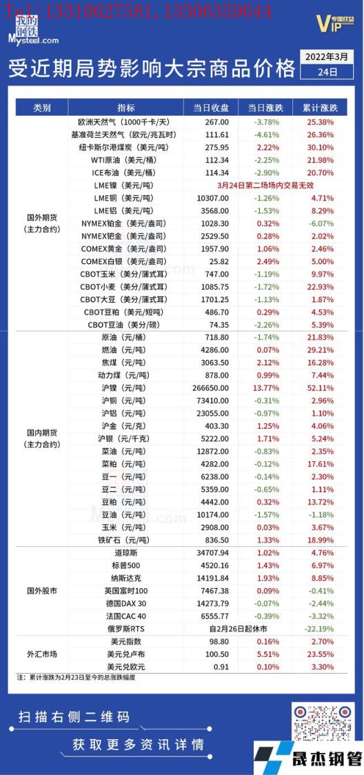 近期,受國際局勢影響,全球金融及大宗商品市場出現較大波動。3月24日,國際油價、能源價格下跌,倫敦金屬交易所(LME)表示,3月24日鎳的第二場場內交易將被視為受到幹擾,該交易期間達成的所有交易將無效。匯總情況如下: