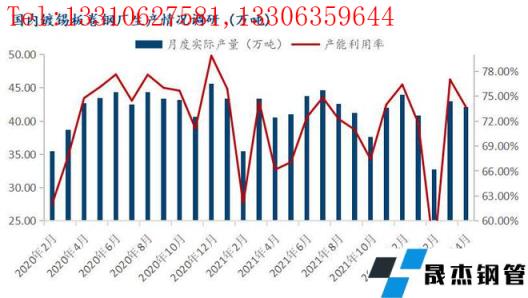 調研數據顯示:據監測的26家鍍錫板生產企業中,共計49條產線,2022年4月份產能利用率73.68%,月環比下降3.31%,同比下降1.09%;4月實際產量42.14萬噸,月環比減少0.87萬噸,同比減少0.55萬噸。從4月份供應看,月環比小幅下降,主要是江蘇地區部分無縫宅男在线小视频鋼管廠家因疫情影響,原料供應收到影響,導致該區域馬口鐵產量收到影響。從曆年馬口鐵供應看情況看每月40-45萬噸處於相對正常水平,3-4月國內馬口鐵供應恢複正常水平。