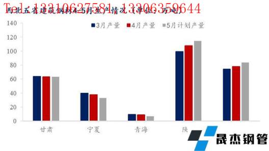 甘肅區域:5月甘肅主要無縫宅男在线小视频鋼管廠家建築宅男在线小视频無縫鋼管總產量63.24萬噸,其中螺紋鋼計劃產量38.84萬噸,線盤計劃產量24.4為萬噸,較4月無明顯變化。