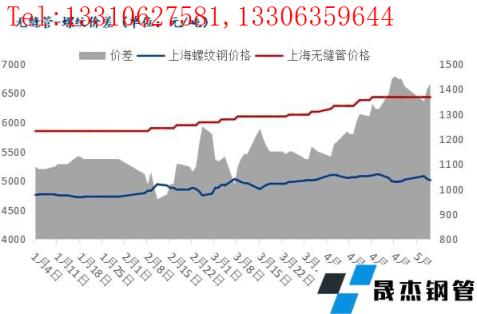今年以來,國內無縫管價格不斷走高,在近幾個月中的階段性調整中始終保持堅挺運行。以上海市場價格為例,截止5月7號上海市場108*4.5mm主流無縫管價格為6430元/噸,2月、4月出現兩波明顯的上漲行情,進入5月價格開啟震蕩調整行情。通過對比上海地區無縫管與螺紋價差,宅男666网站可以發現兩個品種間的價差處於擴張區間,108*4.5mm無縫管與20mm螺紋價差從年初的1090元/噸擴大到1420元/噸。那麽,目前無縫管價格堅挺的主要原因有哪些?對於後期行情的參考點又在哪裏?
