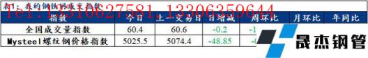 訊:全國建築宅男在线小视频無縫鋼管成交量監測,成交量相對指數來看,全國60.4增0.2,北方41減1.9,華東86.9增0.9,南方45.5減0.3。今日螺紋鋼價格指數5025.5,較上一交易日減48.85。
