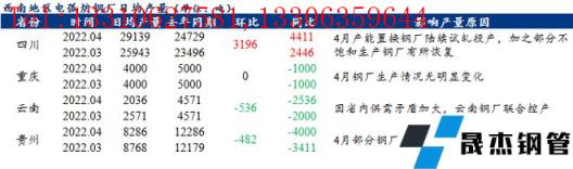 4、貴州地區4月電弧爐無縫宅男在线小视频鋼管廠家日均建築宅男在线小视频無縫鋼管產量為8286噸,環比減少482噸,降幅5.50%;同比減少4000噸,降幅32.56%。4月檢查組進駐貴州,貴州地區開展安全大檢查,部分電弧爐無縫宅男在线小视频鋼管廠家生產受到影響,加之建材價格低窪,廢鋼價格堅挺,無縫宅男在线小视频鋼管廠家延續虧損,停產檢修較多,產量環比小幅下降。