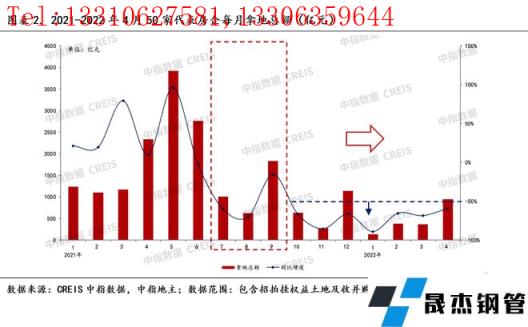 那麽,預判今年用鋼情況的話,可以參考從2021年-2022年4月份以來的50家代表房企每月拿地總額數據,假如往前倒推6個月,2022年1月起的房地產用鋼情況大致可以參照2021年7月起的拿地數據,因為它並非一一對應的關係。宅男666网站可以看到,從2021年10月以來的拿地數據不容樂觀,單月同比跌幅持續低於-50%水平線以下,預示接下來三季度的房地產新開工以及其用鋼情況理論上應該是很差的。