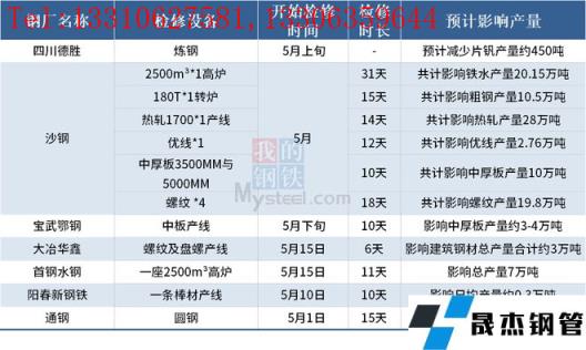 據不完全統計,截至5月12日,國內7家無縫宅男在线小视频鋼管廠家發布檢修計劃。其中,檢修時間最長的是沙鋼 ,2500m³*1高爐檢修31天,共計影響鐵水產量20.15萬噸。
