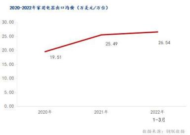 2022年一季度中國家用電器出口均價為26.54萬美元/萬台,2021年一季度家用電器出口均價為25.83萬美元/萬台。