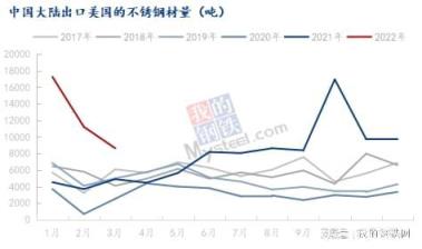 2021年,中國大陸出口美國的不鏽鋼製品的量總計22萬噸(占大陸出口總量的20.3%),2022年1-3月,該量約5.2萬噸(占大陸出口總量的22.3%),同比增加6.8%。