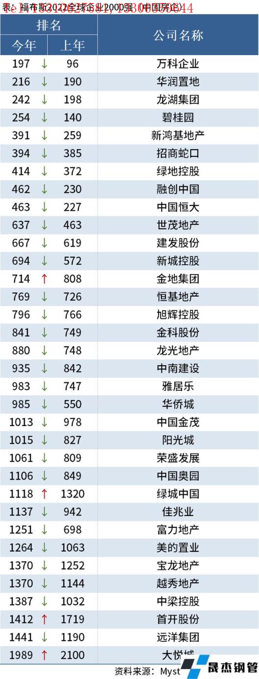 5月12日,福布斯2022全球企業2000強發布。據統計,共有34家中國房地產企業上榜,其中金地集團、綠城中國、首開股份與大悅城四家房企排名有所上升,剩餘30家上榜房企排名均出現下降。