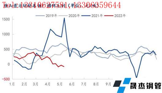 鋼坯盈利情況:本周唐山地區主流樣本無縫宅男在线小视频鋼管廠家平均鐵水不含稅成本為3665元/噸,平均鋼坯含稅成本4721元/噸,周環比下調105元/噸,與5月14日普方坯出廠價格4660元/噸相比,無縫宅男在线小视频鋼管廠家平均毛利潤-61元/噸,周環比下調45元/噸。