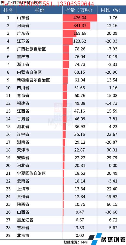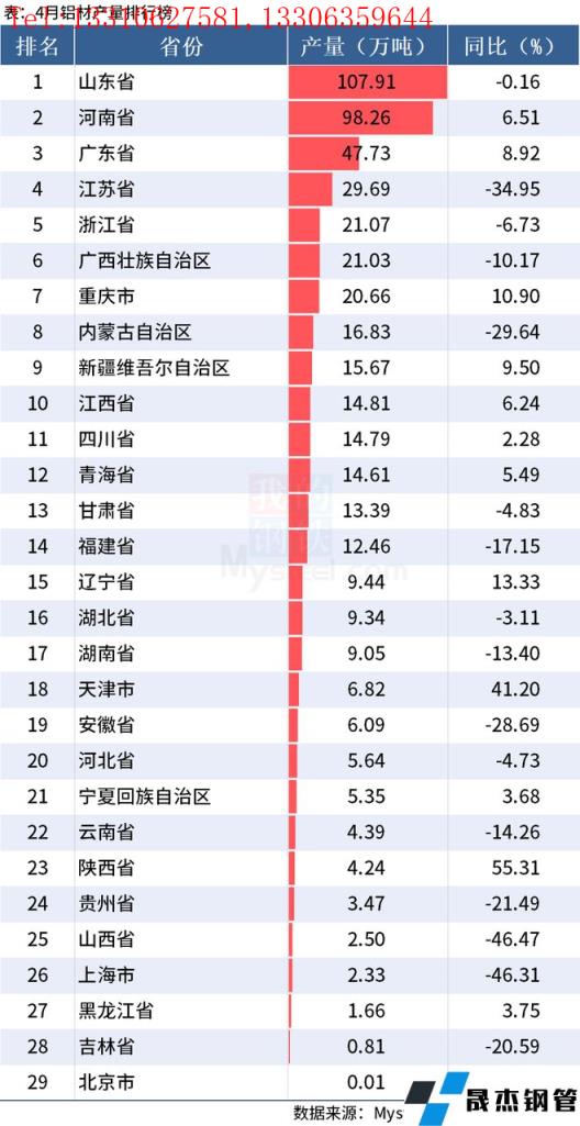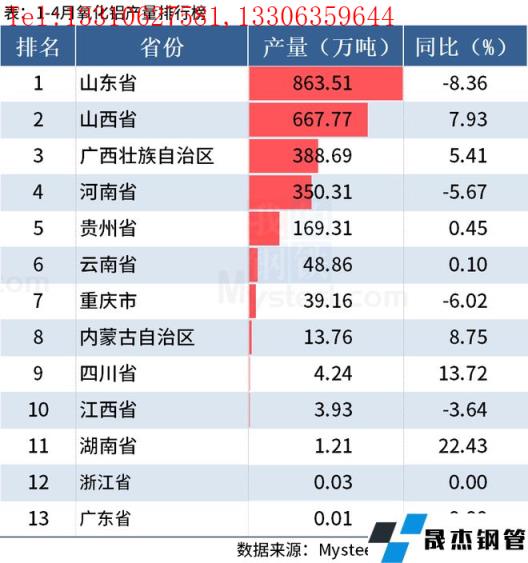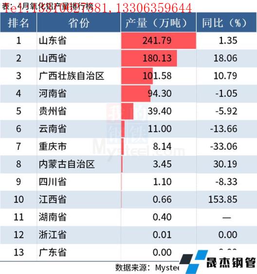 免責聲明:本網站(山東聊城宅男666网站無縫鋼管廠www.fengyun0769.com)刊載的“統計局:前4月全國分省市鋁材、氧化鋁產量出爐”等均源於網絡,版權歸原作者所有,且僅代表原作者觀點,本文所載信息僅供參考。轉載僅為學習與交流之目的,如無意中侵犯您的合法權益,請及時聯係刪除。本網站刊登此篇文章並不意味著本站讚同其觀點或證實其內容的真實性,宅男666网站不對其科學性、嚴肅性等作任何形式的保證。如果侵犯了您的版權,請盡快聯係宅男666网站予以撤銷,謝謝合作!