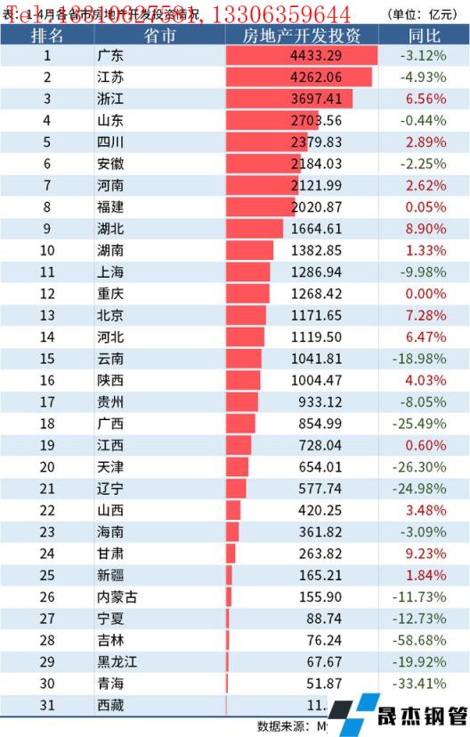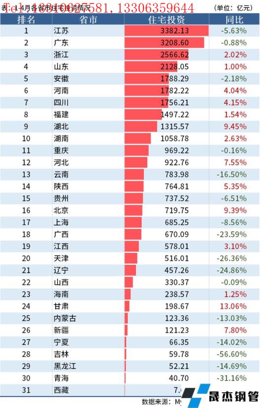 住宅投資方麵,投資額超千億的有10個省市,其中江蘇、廣東和浙江分別以3382.13億元、3208.6億元、2566.62億元的投資額位排名前三。累計同比方麵,有10個省市同比降幅超10%,其中降幅最大的依然是吉林省,同比下降56.6%;同比增幅超10%的僅有甘肅一省,同比增長13.06%。