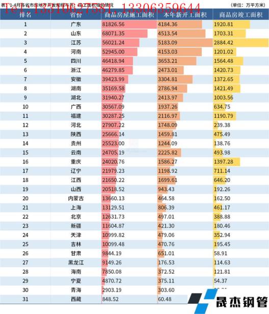 從各省市房地產開發規模與開、竣工麵積增長情況來看,31省市1-4月的商品房屋施工麵積共818512.92萬平方米,其中25省市施工麵積在10000萬平方米以上。排名前三的依然是廣東、山東和江蘇,施工麵積均在50000萬平方米以上,其中廣東施工麵積超80000萬平方米。排在末三位的為寧夏、青海、西藏,施工麵積依然低於5000萬平方米,其中西藏施工麵積僅有848.52萬平方米。