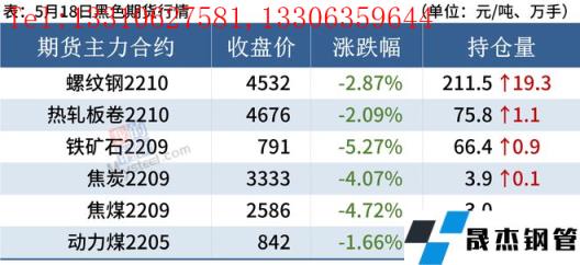 熱軋板卷:5月18日,全國24個主要城市4.75mm熱軋板卷均價4967元/噸,較上個交易日下跌46元/噸。黑色商品期貨整體下挫,成交明顯疲軟,市場情緒偏空。近日盤麵的持續走弱,市場需求低迷態勢仍在延續,目前受疫情製約因素依然明顯,從華東地區來看,需求短期難有明顯增量;另一方麵,近期供應鏈渠道尚未完全打通,使得市場信心不足,疊加地產方麵的利空數據,短期價格將承壓趨弱。預計19日全國熱軋板卷或將趨弱運行為主。