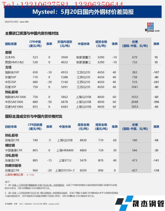 免責聲明:本網站(山東聊城宅男666网站無縫鋼管廠www.fengyun0769.com)刊載的“2022年05月20日日報:國內外鋼材_無縫鋼管價差匯總(2022.5.20)”等均源於網絡,版權歸原作者所有,且僅代表原作者觀點,本文所載信息僅供參考。轉載僅為學習與交流之目的,如無意中侵犯您的合法權益,請及時聯係刪除。本網站刊登此篇文章並不意味著本站讚同其觀點或證實其內容的真實性,宅男666网站不對其科學性、嚴肅性等作任何形式的保證。如果侵犯了您的版權,請盡快聯係宅男666网站予以撤銷,謝謝合作!