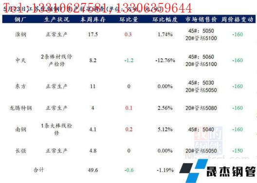 江蘇優特無縫宅男在线小视频鋼管廠家棒材總庫存49.6萬噸,較上周減少0.6萬噸,環比降1.19%,較去年同期增加13.38萬噸,同比增36.94%,目前省內南鋼一條大棒線檢修,中天2條棒材線檢修,其餘無縫宅男在线小视频鋼管廠家正常生產。