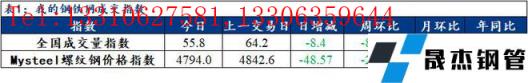 訊:全國建築宅男在线小视频無縫鋼管成交量監測,成交量相對指數來看,全國55.8減8.4,北方44.1增0.8,華東71.7減14.6,南方46.2減7.6。今日螺紋鋼價格指數4794,較上一交易日減48.57。