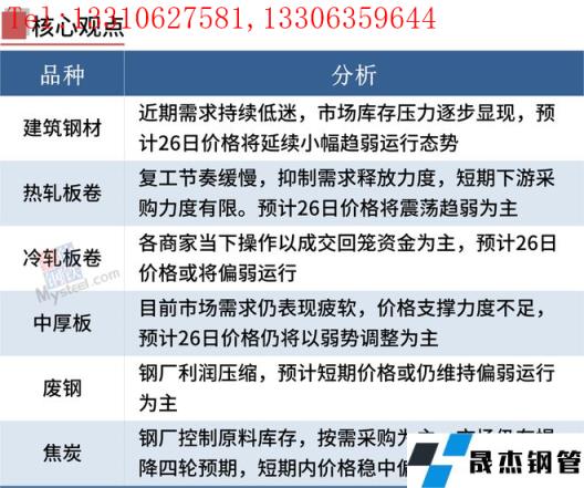 冷軋板卷:5月25日,全國24個主要城市1.0mm冷卷均價5442元/噸,較上個交易日下跌18元/噸。市場交投氛圍極為冷清,商家出貨困難。午後部分市場價格再次下調,但是下調後市場成交依舊未見起色。期貨熱卷連續下行,雖然有小幅反彈之勢,但是下遊對後市情緒多悲觀,采購積極性極差。臨近月底,新一輪的訂貨開始,各商家當下操作以成交回籠資金為主。綜上所述,預計26日國內市場冷軋板卷價格或將偏弱運行。