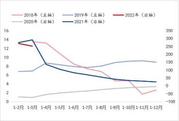 從基礎設施投資增速和房地產開發投資增速來看(涉及到對應年份走勢使用左右軸的區分目的與固定資產投資增速指標的說明一致),兩個指標在2020年-2021年非正常環境條件下的年份增速趨勢基本一致,但在正常環境條件下的年份增速可以看到,伴隨湖北省每年所需完成的經濟增長目標的大背景下,此兩項指標的增速表現呈現此消彼長的走勢。而結合斜率來看,進入2022年1-3月,基礎設施投資增速呈現明顯快速恢複或釋放態勢,而房地產開發投資增速則呈現明顯放緩態勢。由此看來,對於建築宅男在线小视频無縫鋼管品種的需求將在房地產板塊的萎縮預期更為明顯,這與目前所處的房地產調控政策背景是相符的,即便有所改善,筆者認為仍暫難有實質上的新刺激,而基礎設施投資或將是托底的支撐因素之一。綜合來看,湖北省宏觀指標數據的預期演變表明對於建築宅男在线小视频無縫鋼管品種的需求預期呈現萎縮態勢,這與產能角度的供應增加形成供需矛盾加劇的預期,因此這是導致建築宅男在线小视频無縫鋼管價格偏低運行的外因之一。