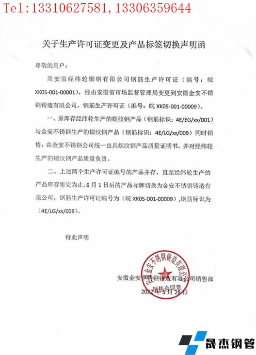 二、上述兩個生產許可證編號的產品並存,直至經緯輪生產的產品庫存售完為止。6月1日後的產品標牌切換為金安不鏽鋼鑄造有限公司,鋼筋生產許可證編號為(皖XK05-001-00009),鋼筋標識為(4E/LG/xx/009)。