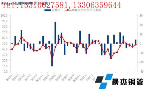 5月份,全國鋼鐵行業無縫宅男在线小视频鋼管廠家產出指數較4月份小幅回升4.2個百分點,終值48.6。具體來看,上半月隨著部分區域高爐檢修結束陸續複產,粗鋼產量整體回升,但後半月成材價格持續下行,導致無縫宅男在线小视频鋼管廠家生產盈利大幅收縮,尤其是短流程企業已全線虧損,部分無縫宅男在线小视频鋼管廠家主動停減產,成材產量隨之下行。