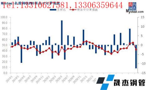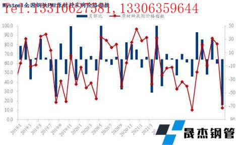 從相關指數來看,本月成品材出廠價指數大幅回落60.4個百分點至8.3,刷新年內低點,無縫宅男在线小视频鋼管廠家成品材庫存指數回落9.5個百分點至63.4,仍處榮枯線上方。同時成材價格下跌倒逼原料價格,本月原材料采購價指數大幅回落68.5個百分點至12.1,國內原材料采購量指數回落6.6個百分點至45.3,國外原材料采購量指數回落5.6個百分點至38.5。