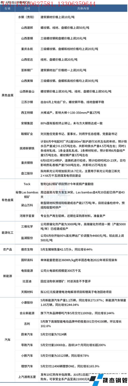 西王特鋼大棒減產,影響大棒Φ130-350mm產量2萬噸;江蘇沙鋼出台6月上旬出廠價,螺紋鋼平穩、線材盤螺平穩;Teck智利QB2銅礦項目預計今年底銅產量翻倍;天賜材料擬12億元投建鋰電池電解液項目和鋰離子電池回收項目。