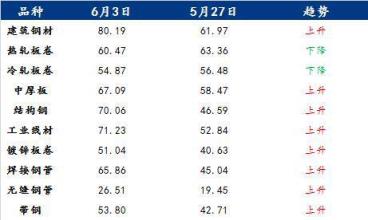 具體各品種指數來看,6月3日建築宅男在线小视频無縫鋼管情緒指數為80.19,較5月27日回升18.22;熱軋板卷情緒指數為60.47,較5月27日回落2.89;冷軋板卷情緒指數為54.87,較5月27日回落1.61;中厚板情緒指數為67.09,較5月27日回升8.62;結構鋼情緒指數為70.06,較5月27日回升23.47;工業線材情緒指數為71.23,較5月27日回升18.39;鍍鋅板卷情緒指數為51.04,較5月27日回升10.41;焊接宅男在线小视频鋼管情緒指數為65.86,較5月27日回升20.82;無縫宅男在线小视频鋼管情緒指數為26.51,較5月27日回升7.06;帶鋼情緒指數為53.8,較5月27日回升11.09。