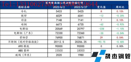 截止2022年6月2日,各原材料當日即時價格以及價格周環比情況如下: